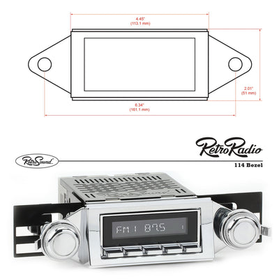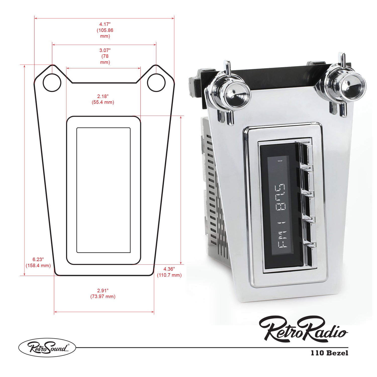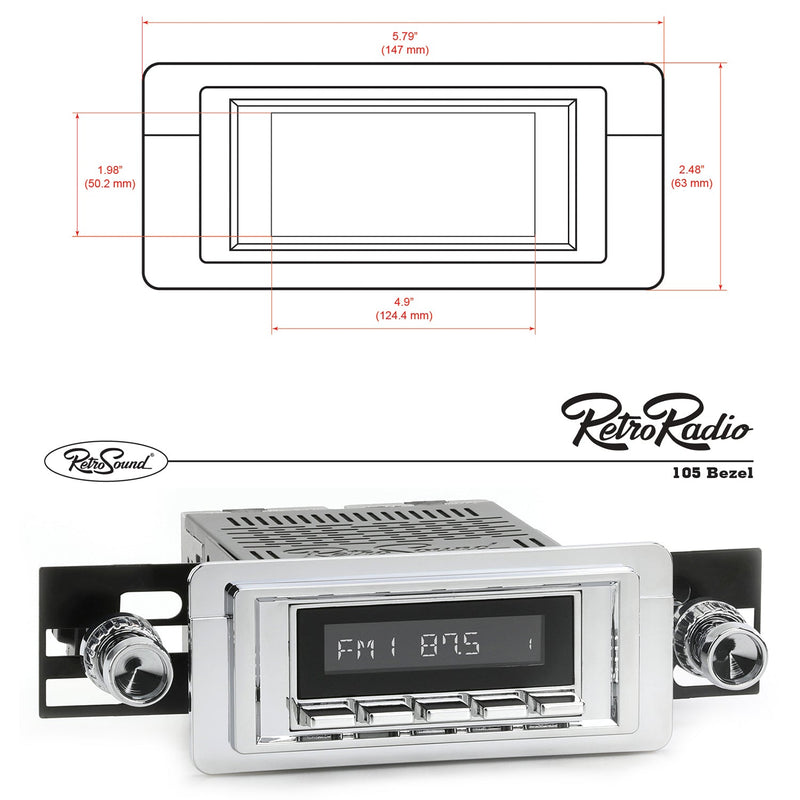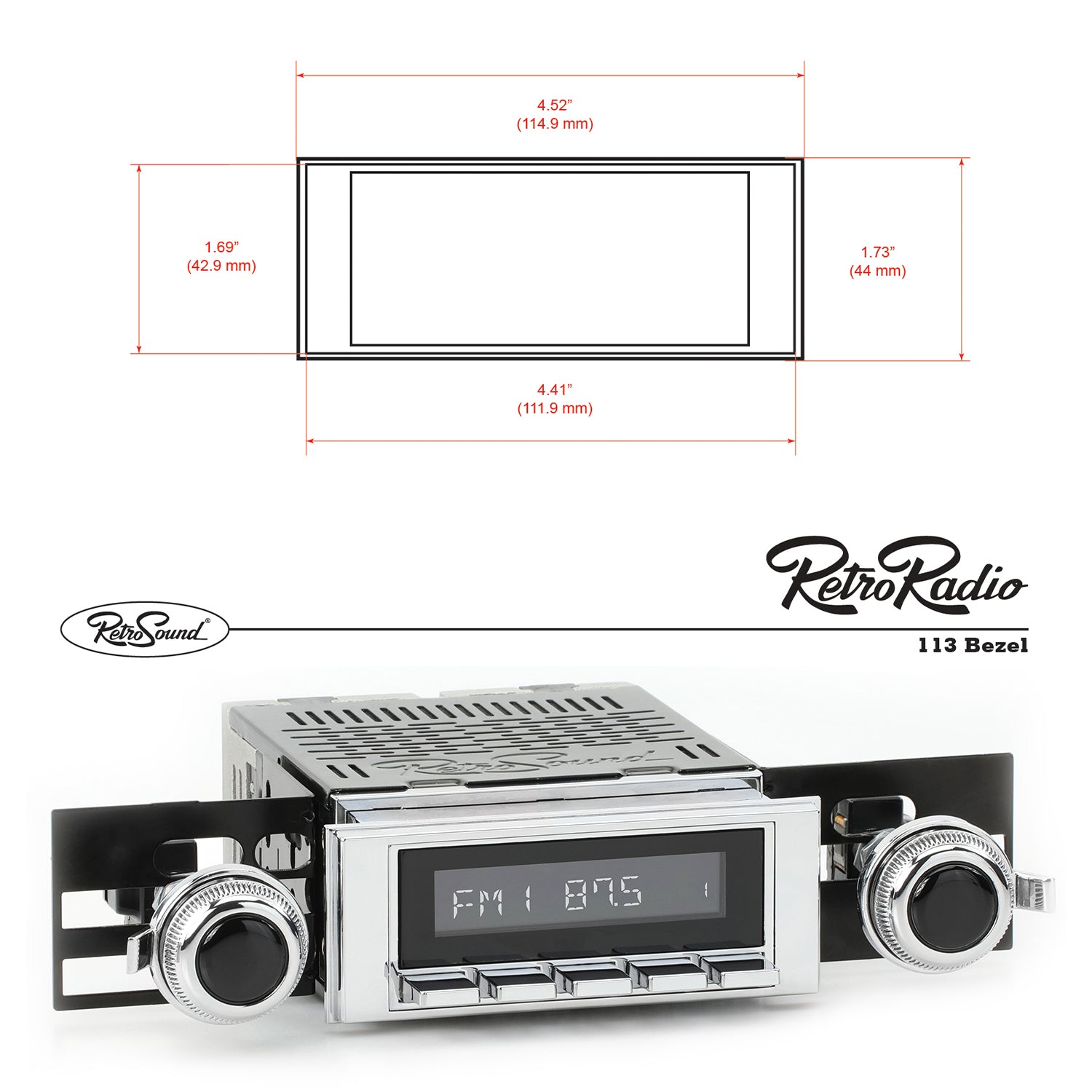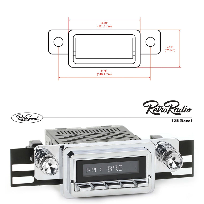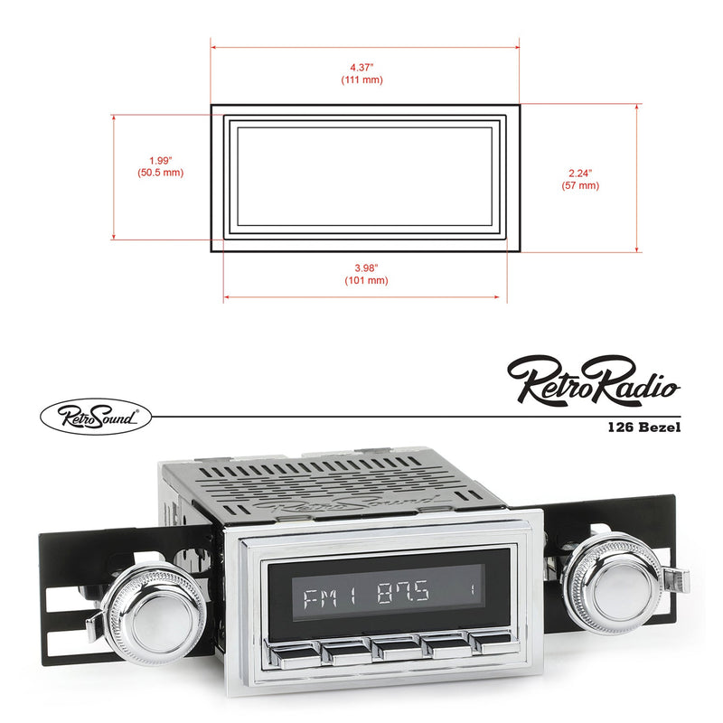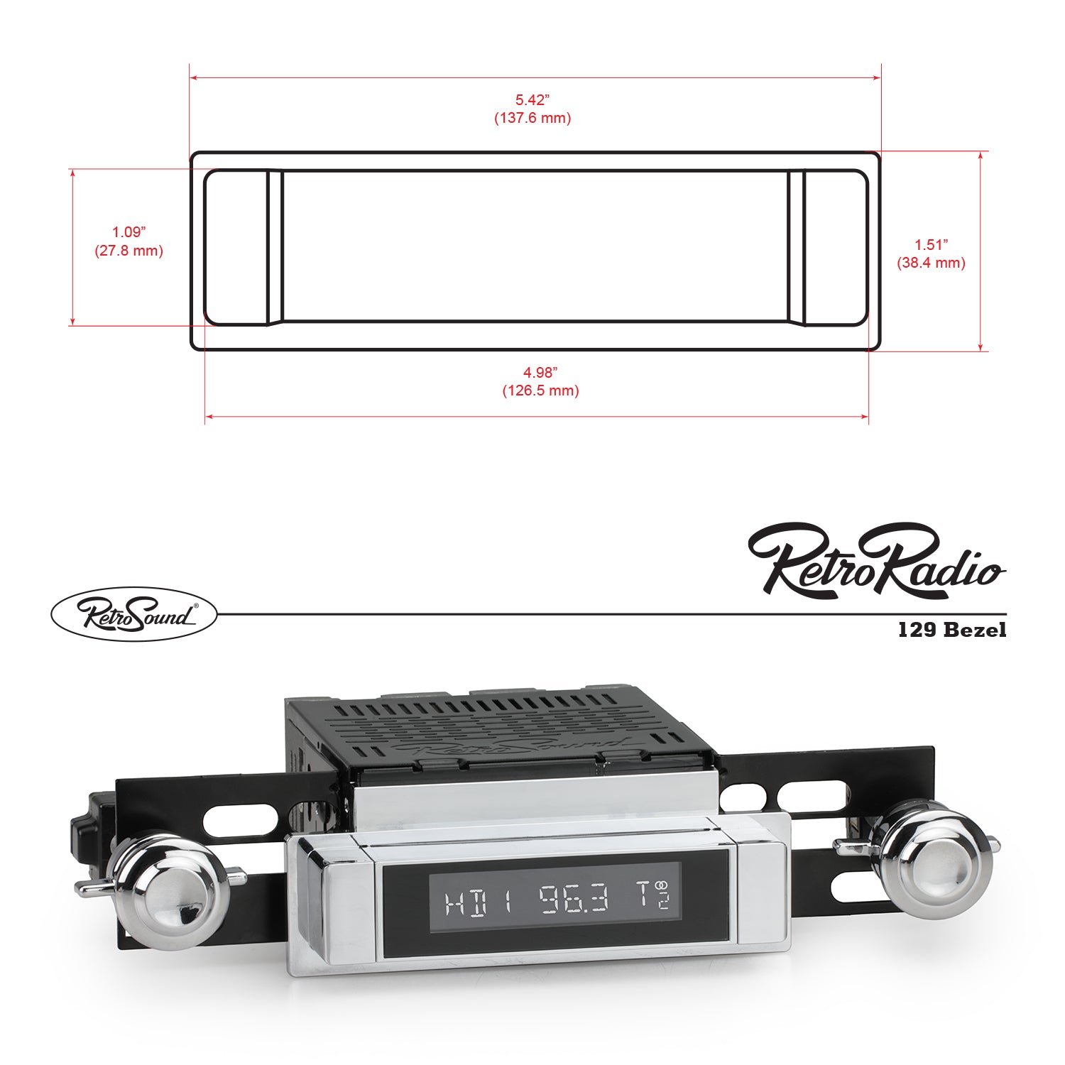 Mounting bezels for RetroSound® Motor 1, Motor 2 or Motor 4 radios. Dimensions are listed here for each bezel. Note that a bezel is made to fit over the nose of the radio and mounted from behind the dash. If you are looking for a trim piece to over-lay the front of the dash, see our selection of faceplates. Please note that bezel part numbers 107, and 129, are made to fit the Apache radio only.