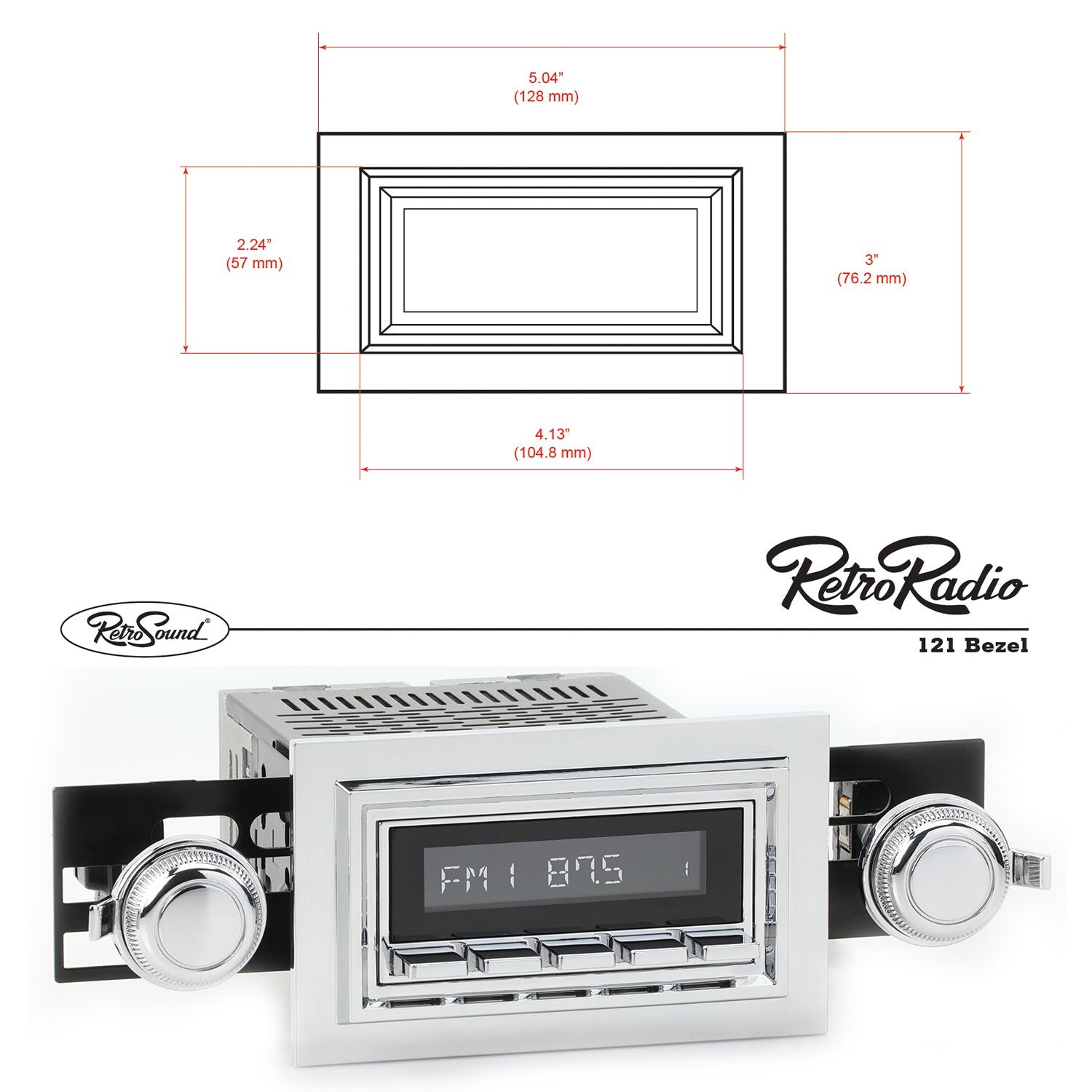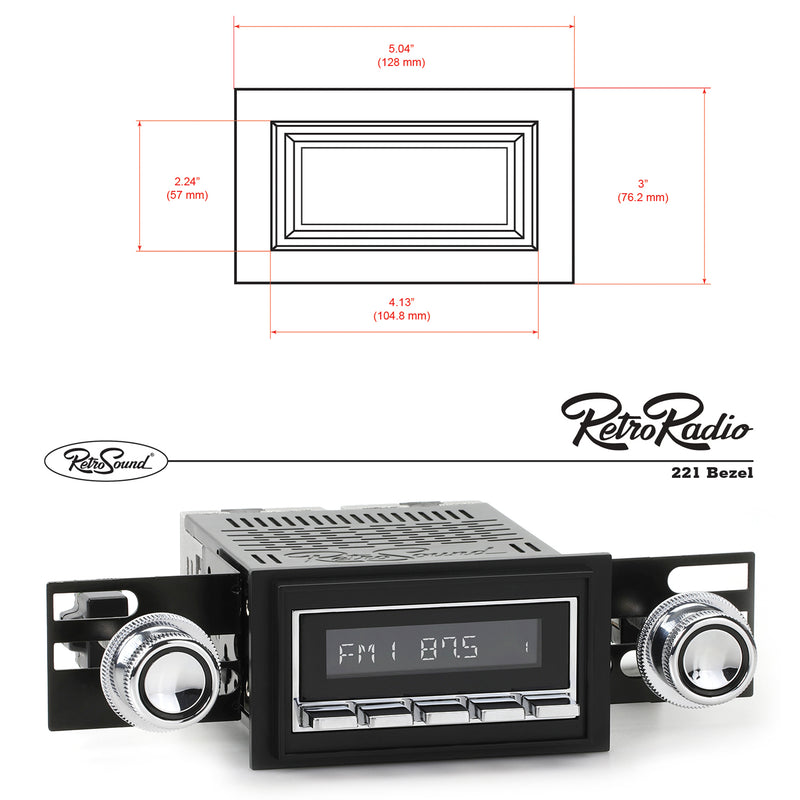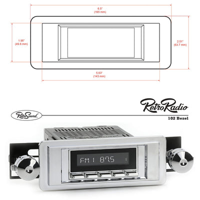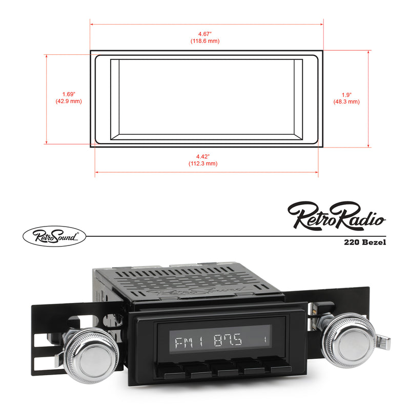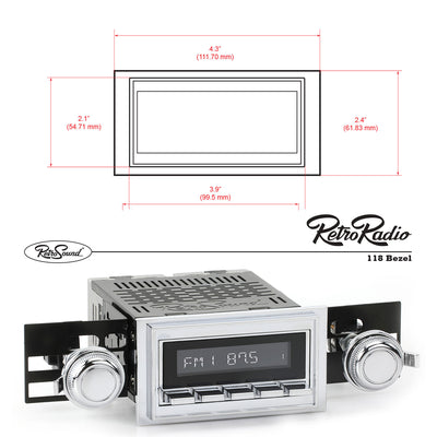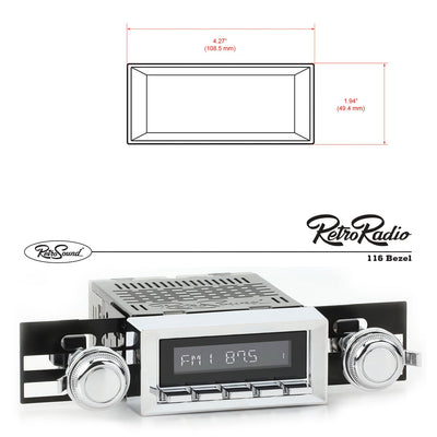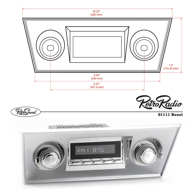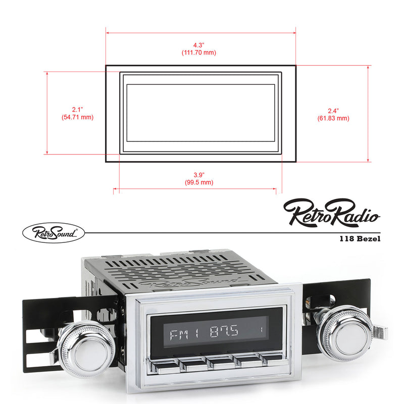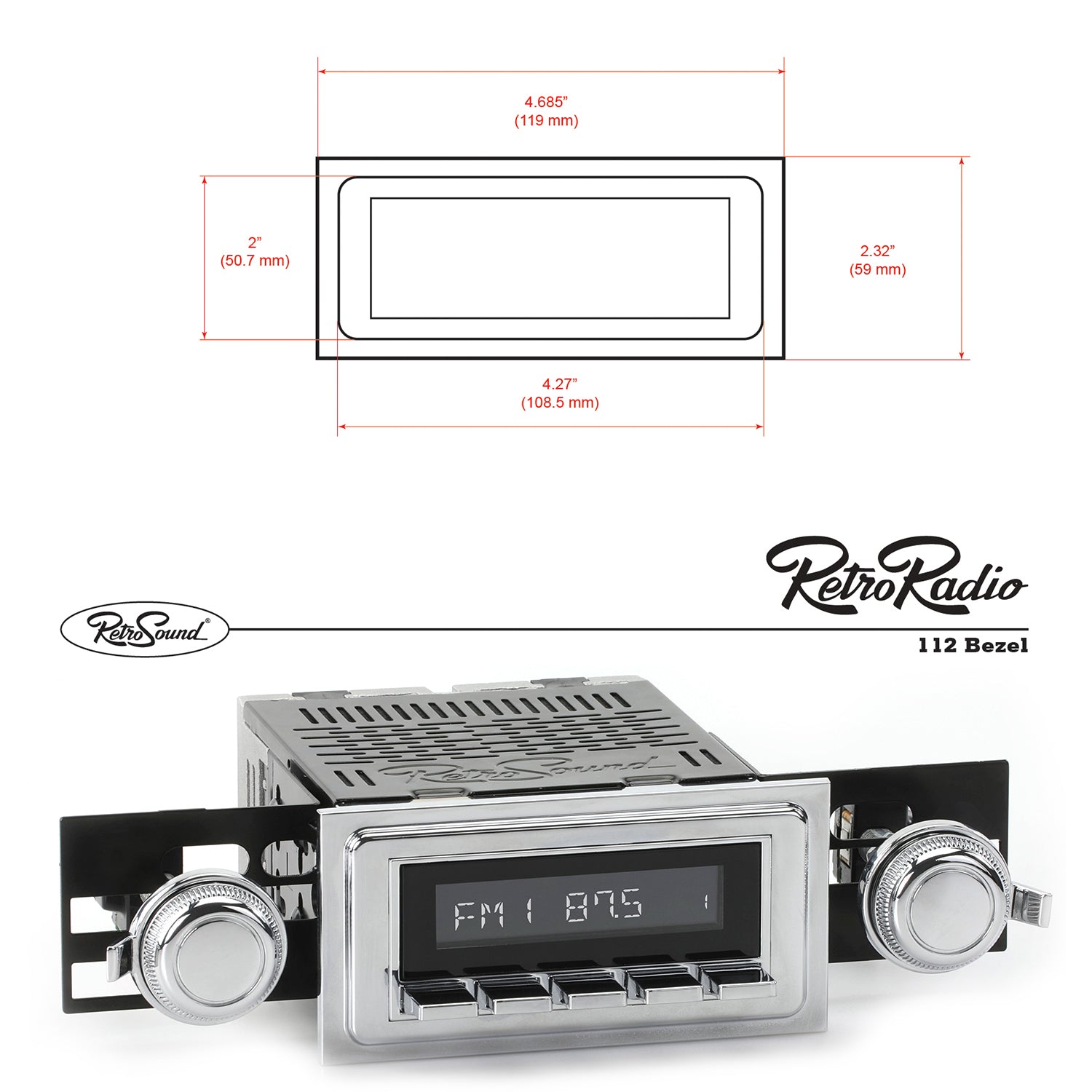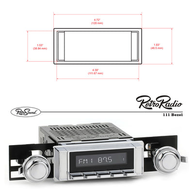 Mounting bezels for RetroSound® Motor 1, Motor 2 or Motor 4 radios. Dimensions are listed here for each bezel. Note that a bezel is made to fit over the nose of the radio and mounted from behind the dash. If you are looking for a trim piece to over-lay the front of the dash, see our selection of faceplates. Please note that bezel part numbers 107, and 129, are made to fit the Apache radio only.