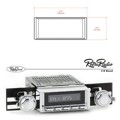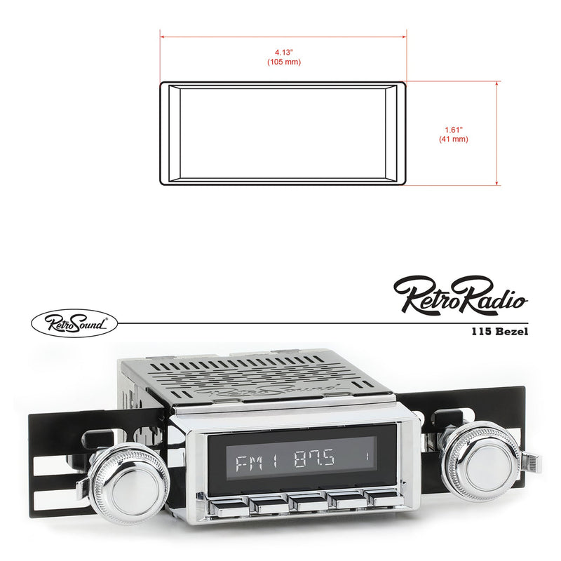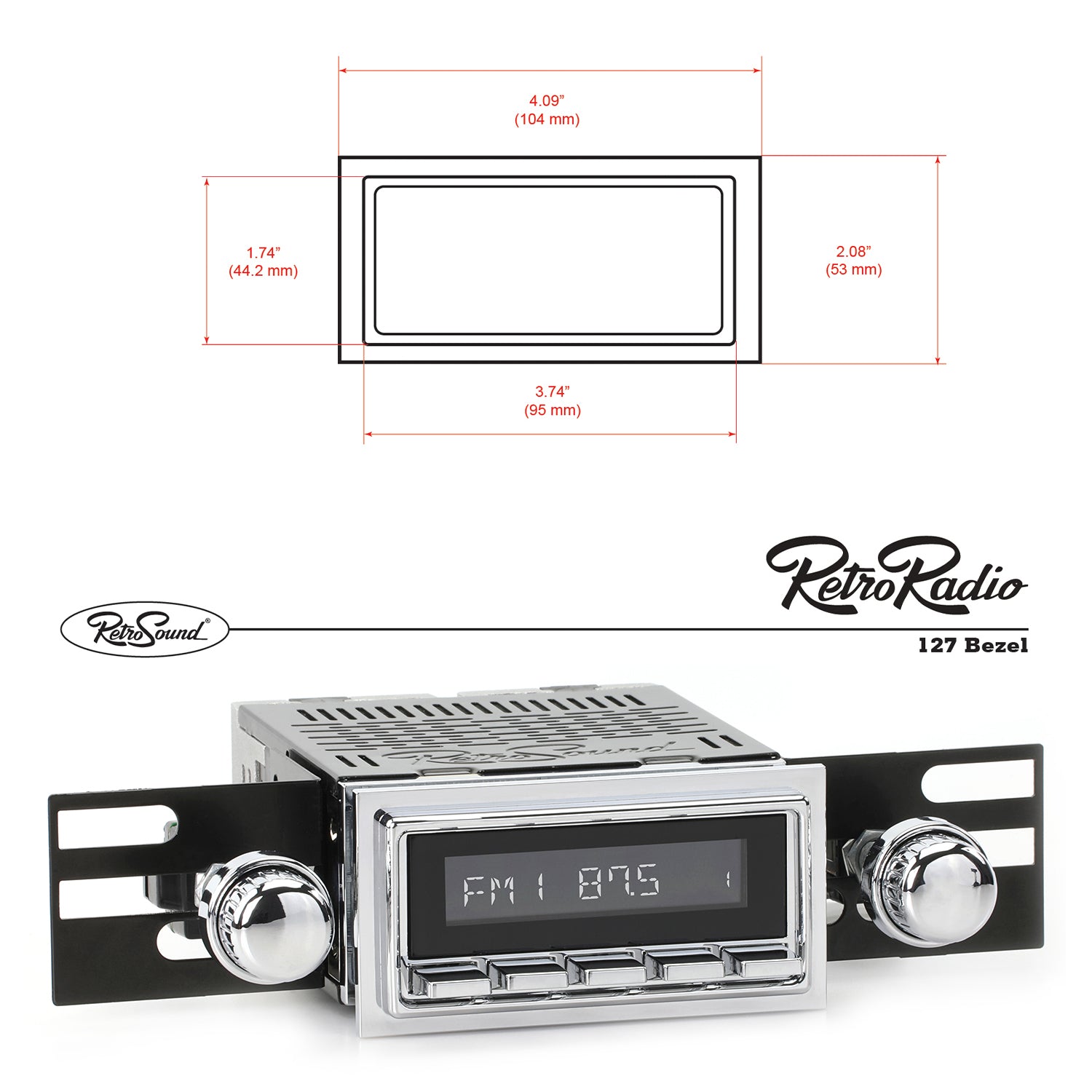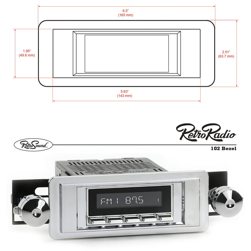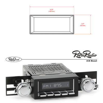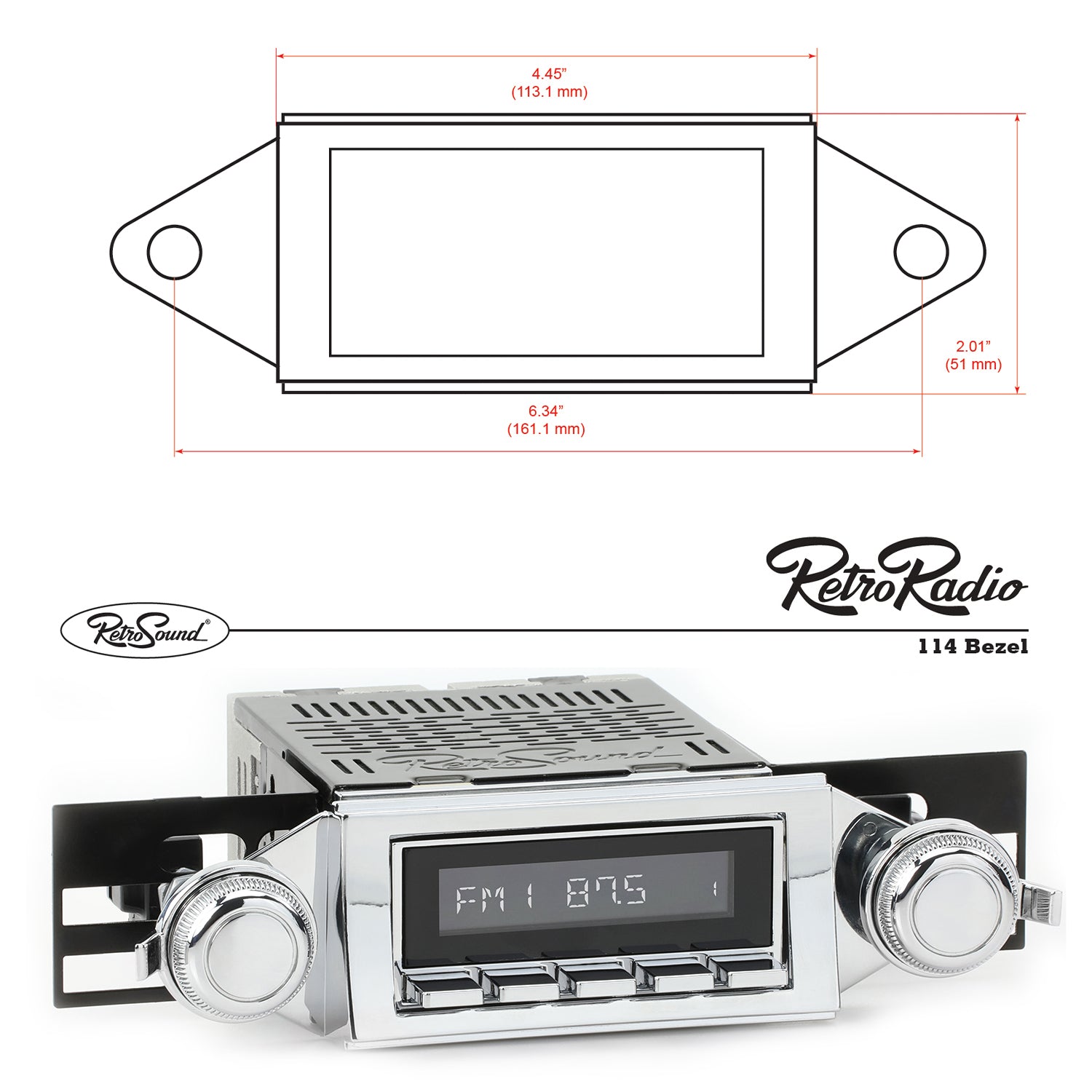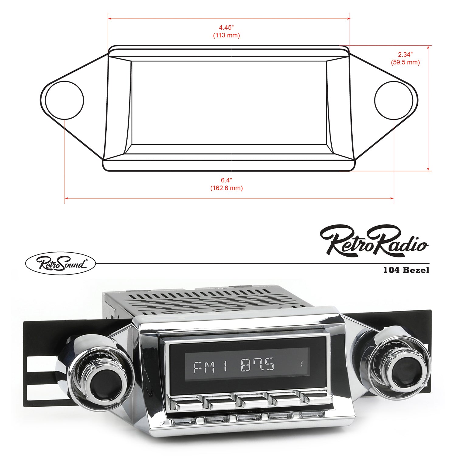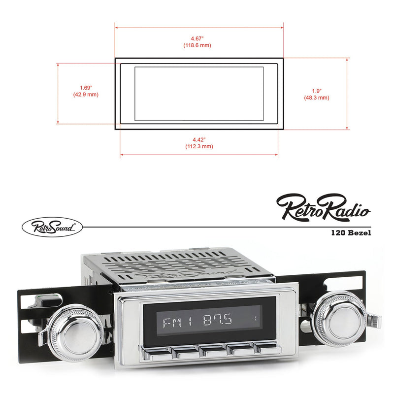 Mounting bezels for RetroSound® Motor 1, Motor 2 or Motor 4 radios. Dimensions are listed here for each bezel. Note that a bezel is made to fit over the nose of the radio and mounted from behind the dash. If you are looking for a trim piece to over-lay the front of the dash, see our selection of faceplates. Please note that bezel part numbers 107, and 129, are made to fit the Apache radio only.