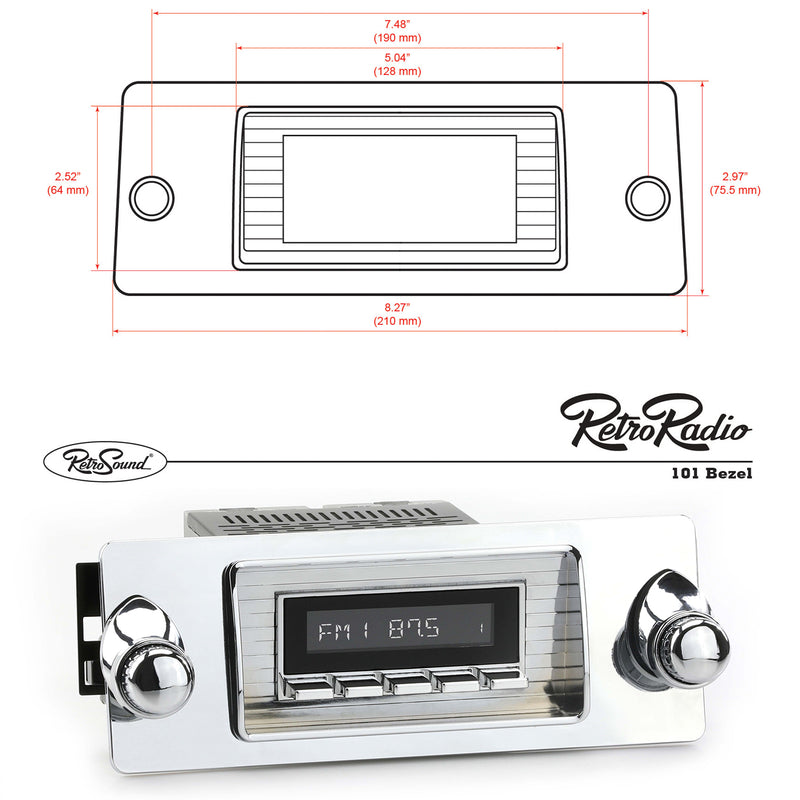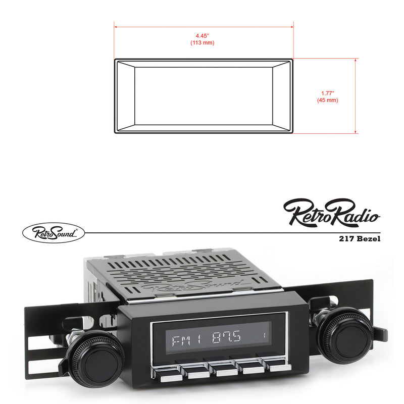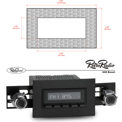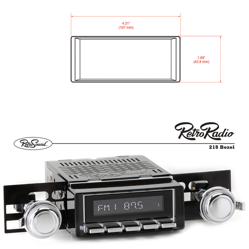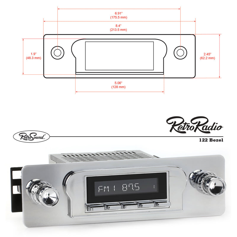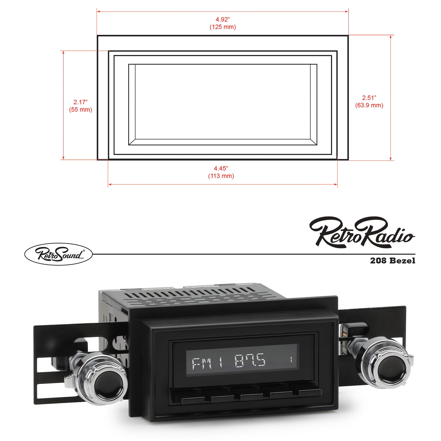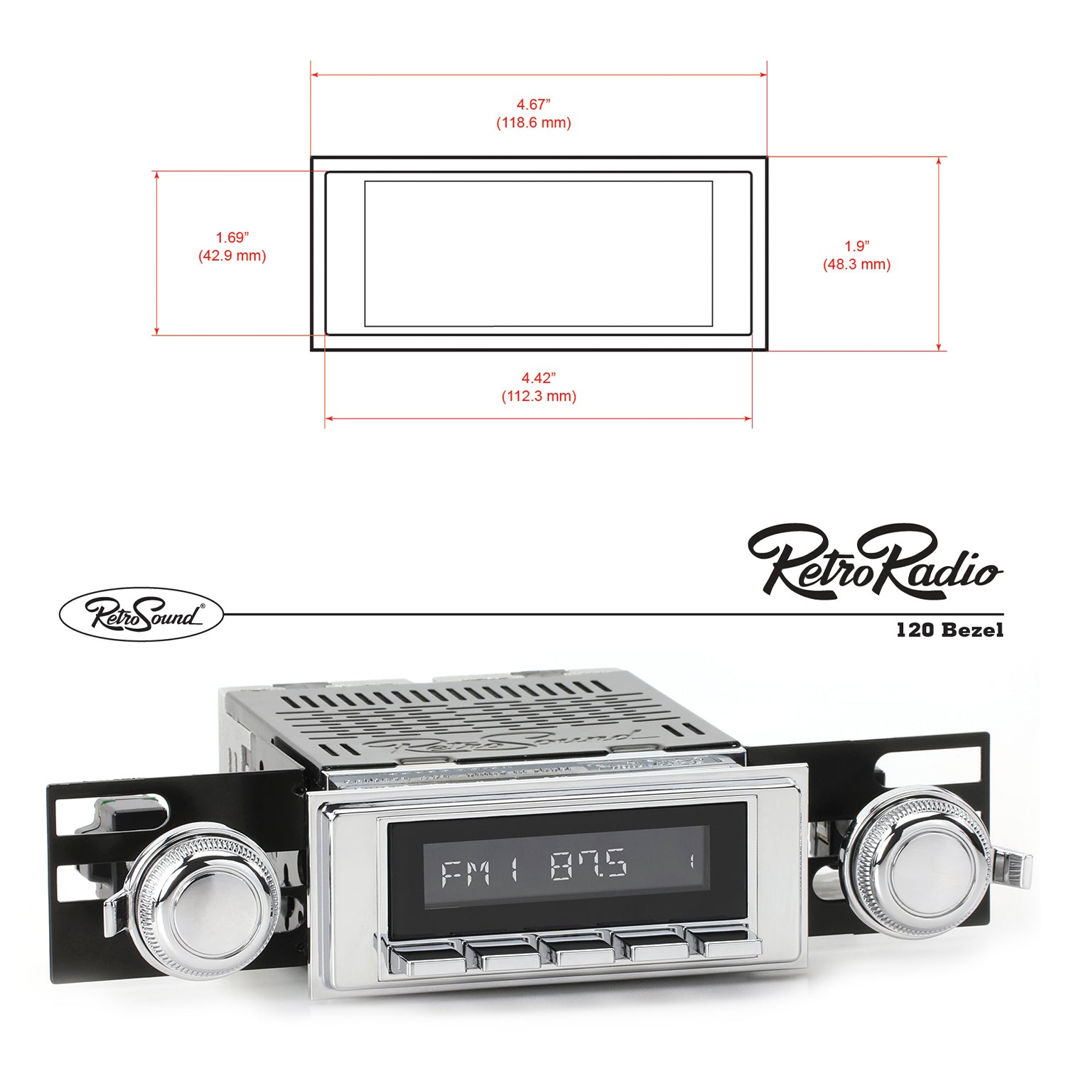 Mounting bezels for RetroSound® Motor 1, Motor 2 or Motor 4 radios. Dimensions are listed here for each bezel. Note that a bezel is made to fit over the nose of the radio and mounted from behind the dash. If you are looking for a trim piece to over-lay the front of the dash, see our selection of faceplates. Please note that bezel part numbers 107, and 129, are made to fit the Apache radio only.