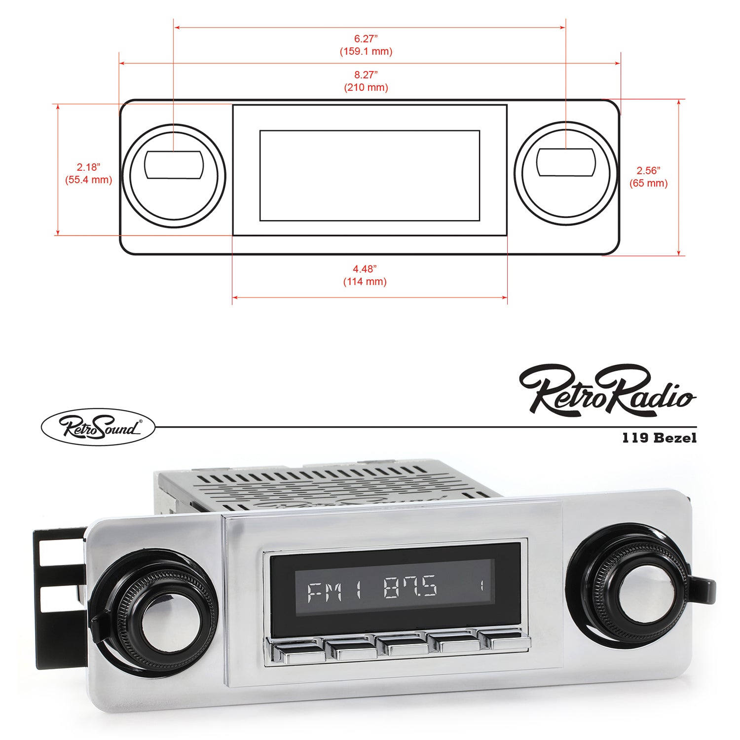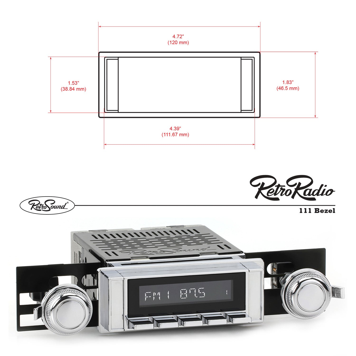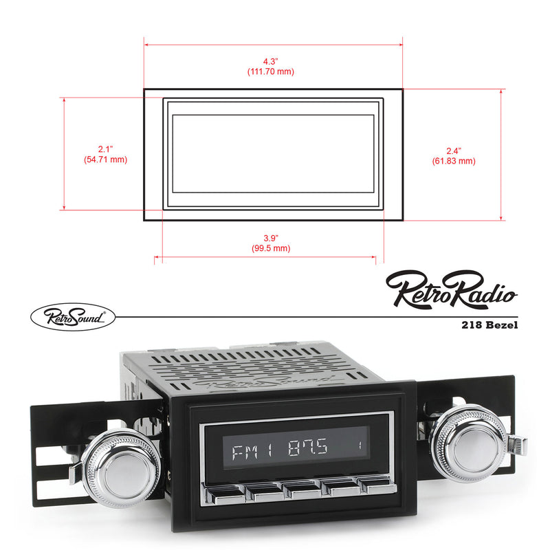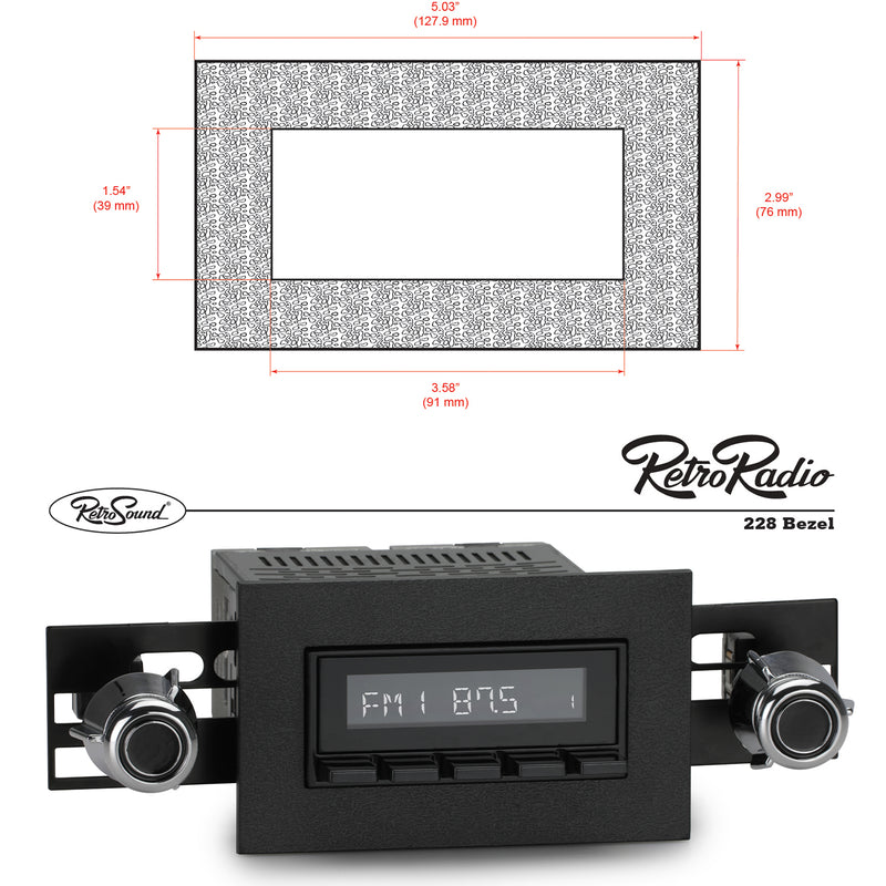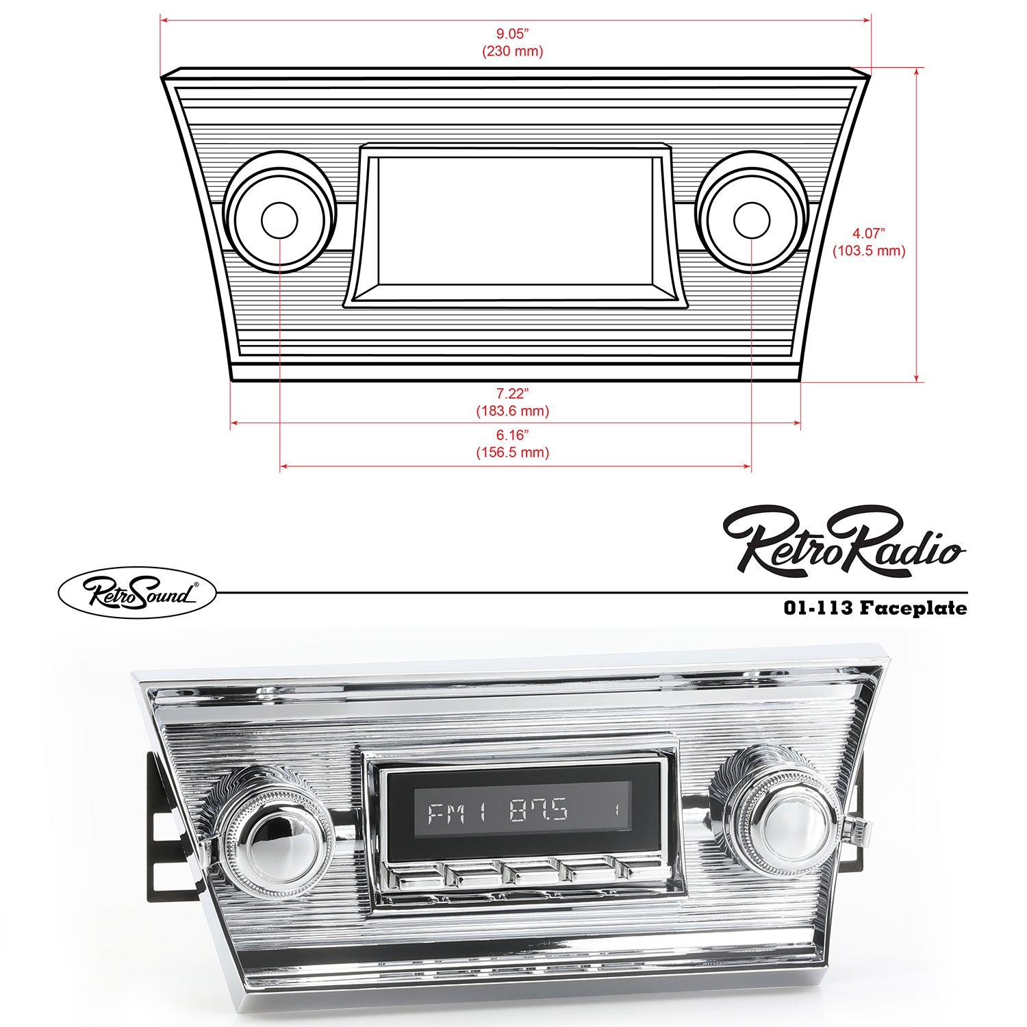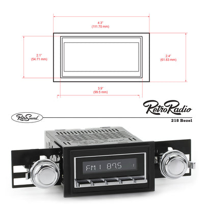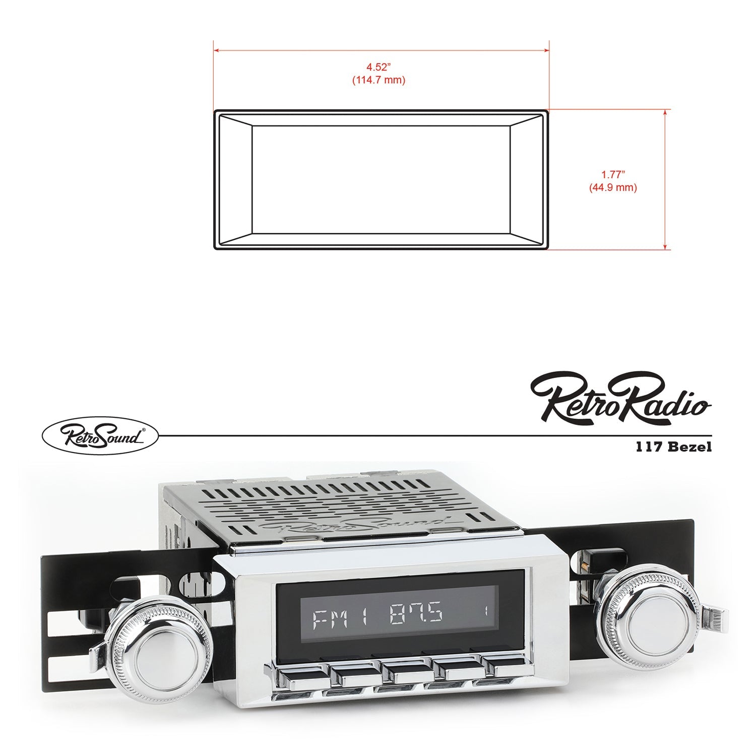Mounting bezels for RetroSound® Motor 1, Motor 2 or Motor 4 radios. Dimensions are listed here for each bezel. Note that a bezel is made to fit over the nose of the radio and mounted from behind the dash. If you are looking for a trim piece to over-lay the front of the dash, see our selection of faceplates. Please note that bezel part numbers 107, and 129, are made to fit the Apache radio only.