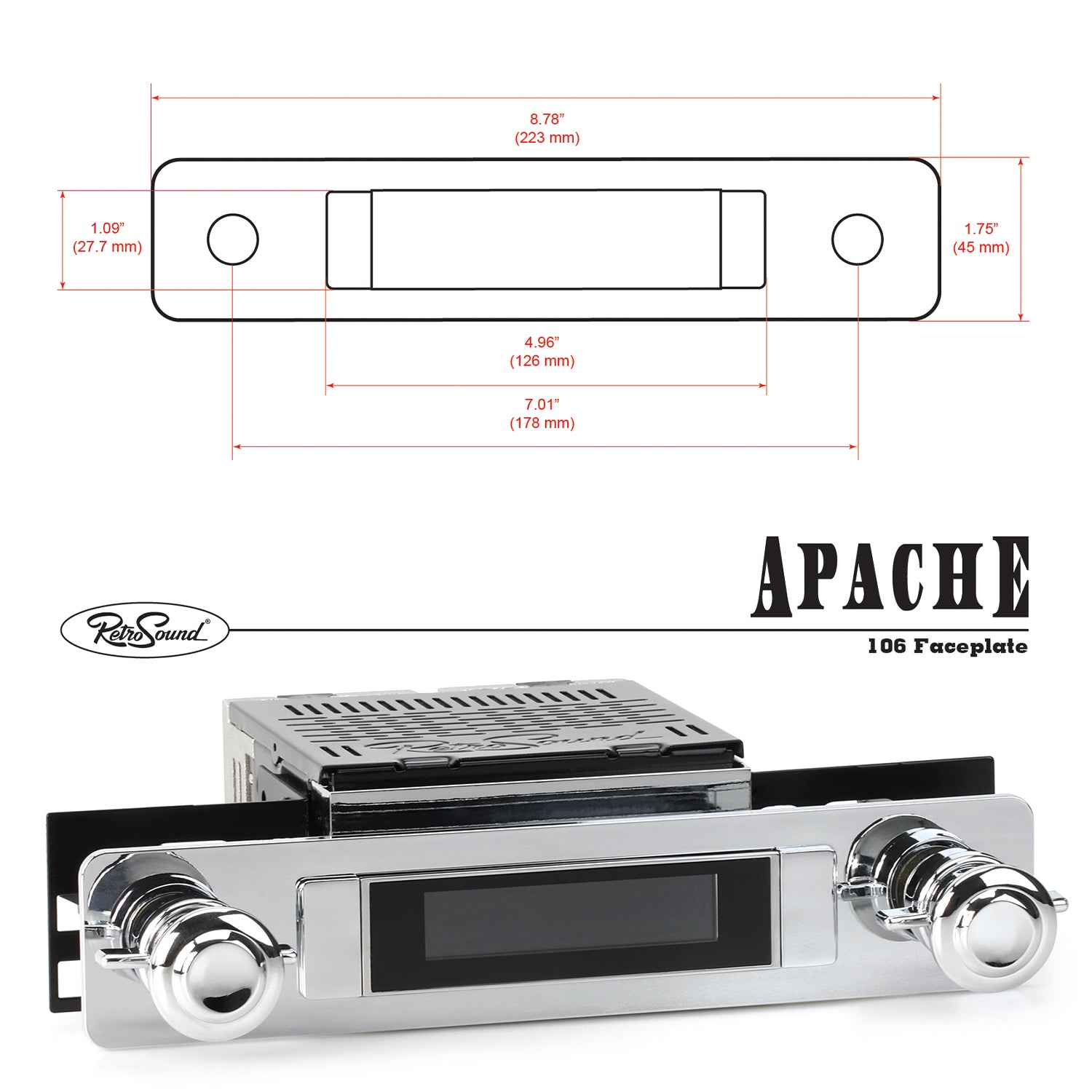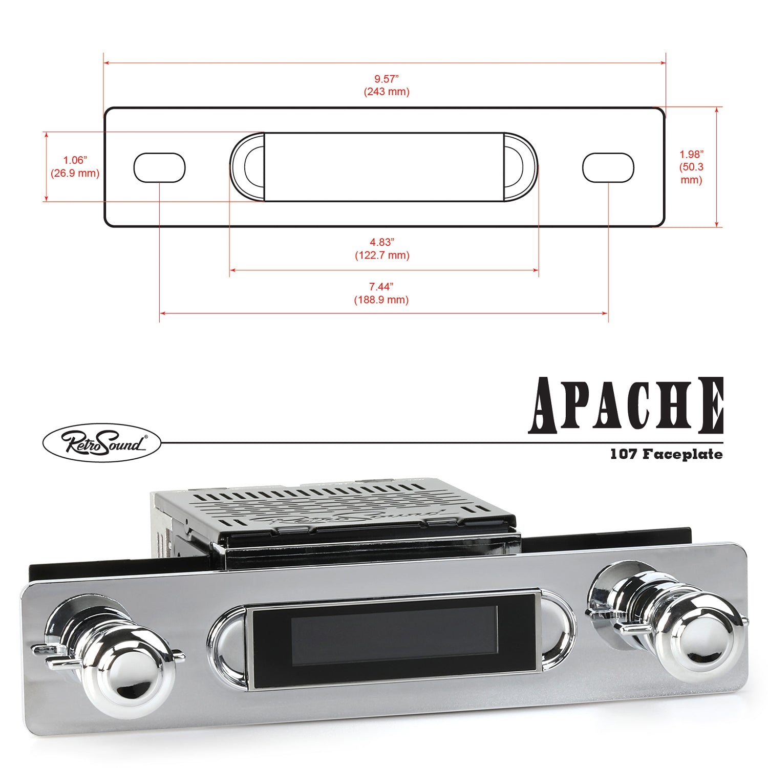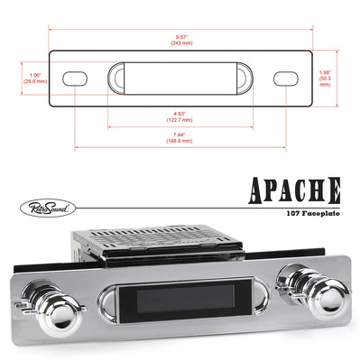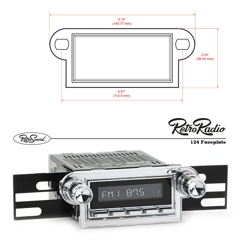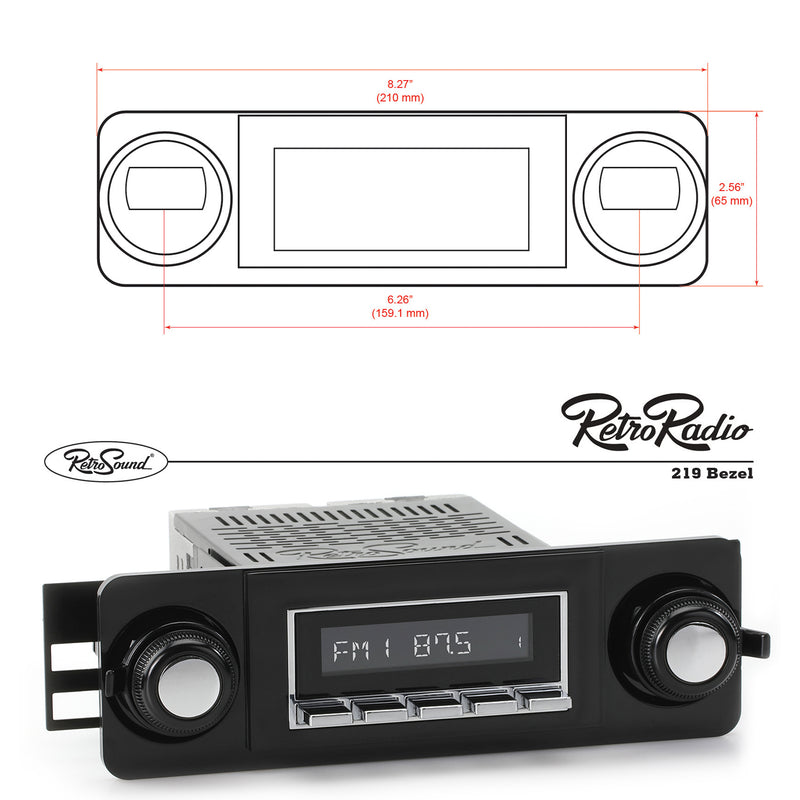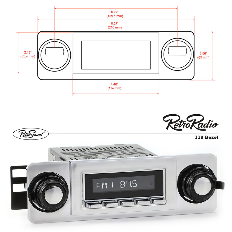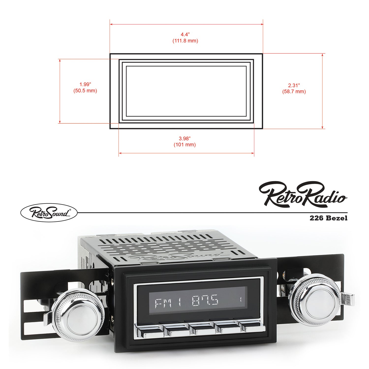 Mounting bezels for RetroSound® Motor 1, Motor 2 or Motor 4 radios. Dimensions are listed here for each bezel. Note that a bezel is made to fit over the nose of the radio and mounted from behind the dash. If you are looking for a trim piece to over-lay the front of the dash, see our selection of faceplates. Please note that bezel part numbers 107, and 129, are made to fit the Apache radio only.