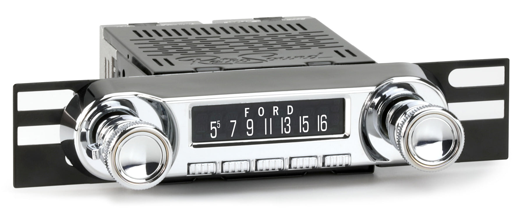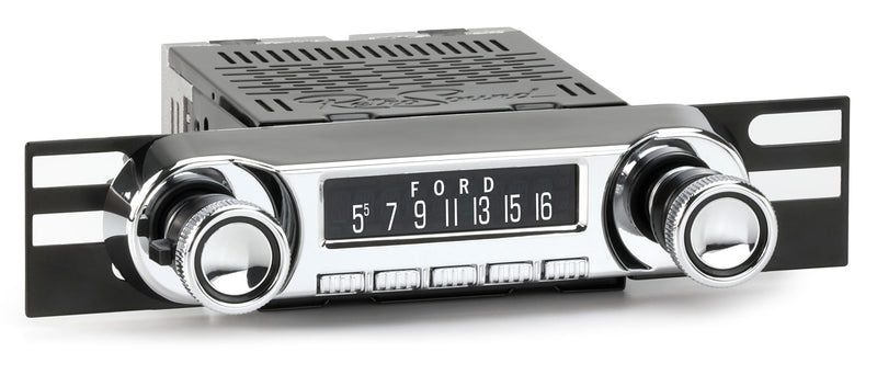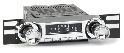 The RetroSound® Huntington is a direct-fit replacement radio for your classic 1966-77 Ford Bronco or 1961-66 Ford Truck. Huntington looks and fits like the original Ford factory radio, but boasts the most modern technological features. Bluetooth® connectivity is built in, for hands-free phone calls and wireless audio streaming. Huntington features a 32,000 color display to match the interior and dash lighting of your Ford F-Series Pickup. The Huntington includes a rear-mounted USB port for flash drives plus two standard auxiliary inputs. The Huntington has a built-in 25 watts x 4 channel power amplifier as well as front and rear RCA pre-outs, that allow the ability to add external amplifiers.