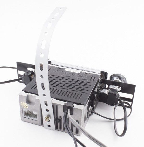 The backstrap allows you to secure the rear of the radio. The backstrap mounts to the rear of the radio and can be bent or trimmed to align with the mounting point of the original factory radio behind the dash.