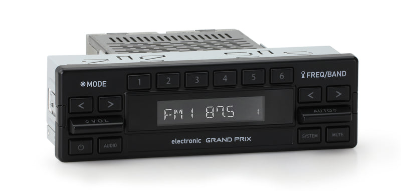 The RetroSound® Grand Prix perfectly compliments the interior styling of the 1980s Mercedes, BMW, & Porsche vehicles while updating the audio technology to today's standards. The unique design of the Grand Prix features authentic paddle-style controls along with low profile push-buttons and a 32,000 color digital display. The Grand Prix is the perfect solution for updating the audio in your classic Mercedes, BMW, or Porsche while maintaining the original style of the factory electronics. A new Din Kit (#296) is included for an easy installation and factory-like fit.