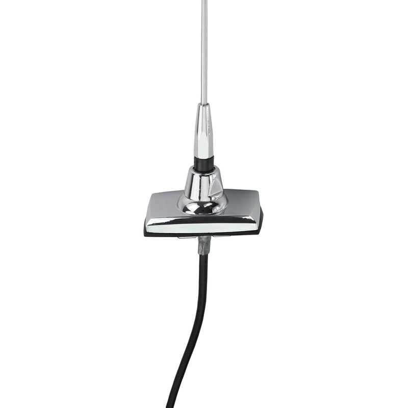 This is a 1970-77 Ford Maverick replacement antenna with a rectangular base and semi-collapsible or fixed mast. It uses all metal mounting parts and a rugged stainless mast. Antenna cable is included.