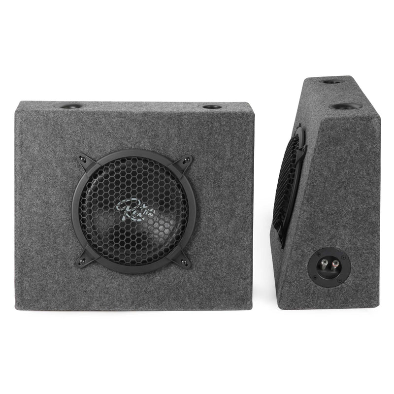 The RetroSound® R-TB8 is a ported full-range speaker enclosure. These wedge shaped speaker boxes work great behind the seats of trucks, SUV's, hatchbacks and coupes. They feature an 8-inch bass driver for great low frequency response and soft-dome tweeters for smooth, clear highs. They are finished in a durable gray carpeting and have chrome speaker terminals. Power handling is 175 watts. Price is per two speaker boxes, one for the driver's side and one for the passenger side.
